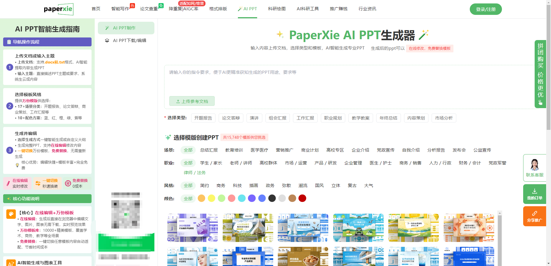 最尴尬的答辩现场,莫过于和同学撞了同一款老旧模板,版式、配色一模一样,连导师都能一眼看出是批量套用的。Paperxie 的 AI PPT 生成功能,直接用海量模板解决了这个痛点 —— 这里有超过 15748 个模板供你选择,覆盖学术、商务、教学等全场景,完全不用再去网上找盗版、低清的模板。