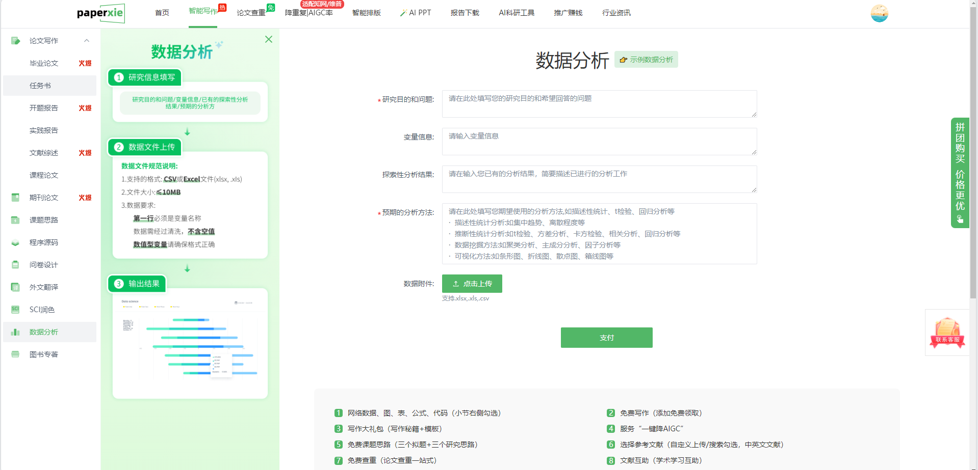 Paperxie 的数据分析功能直接支持 CSV 或 Excel 文件(.xls/.xlsx)上传,还提前明确了格式规则: