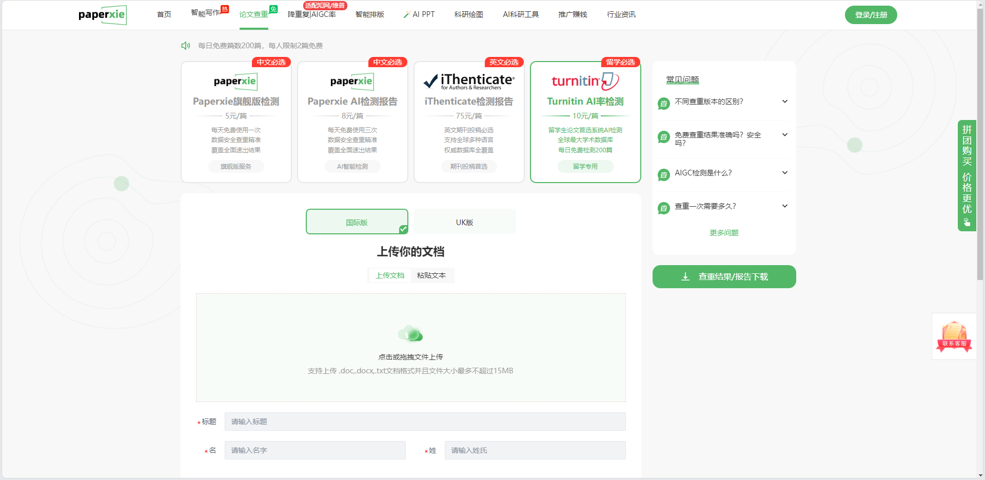 这种 “分场景工具库” 的模式,让不同阶段、不同类型的论文都能找到对应的检测工具 —— 例如国内学生写中文论文用 “旗舰版”,留学党写英文论文用 “Turnitin”,投稿期刊用 “iThenticate”,无需在多个平台之间切换。