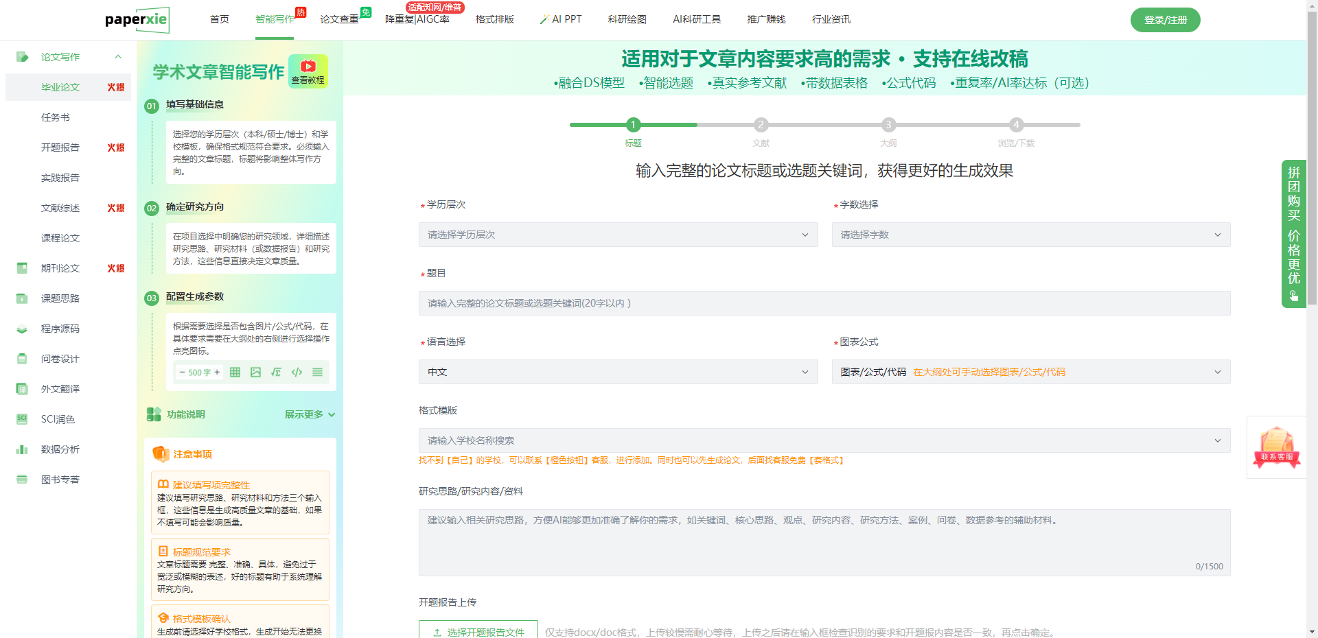 - 右侧提示:用橙色框重点标注 “建议填写研究思路”“标题规范要求”“格式模板确认” 等注意事项,提前规避常见坑点。