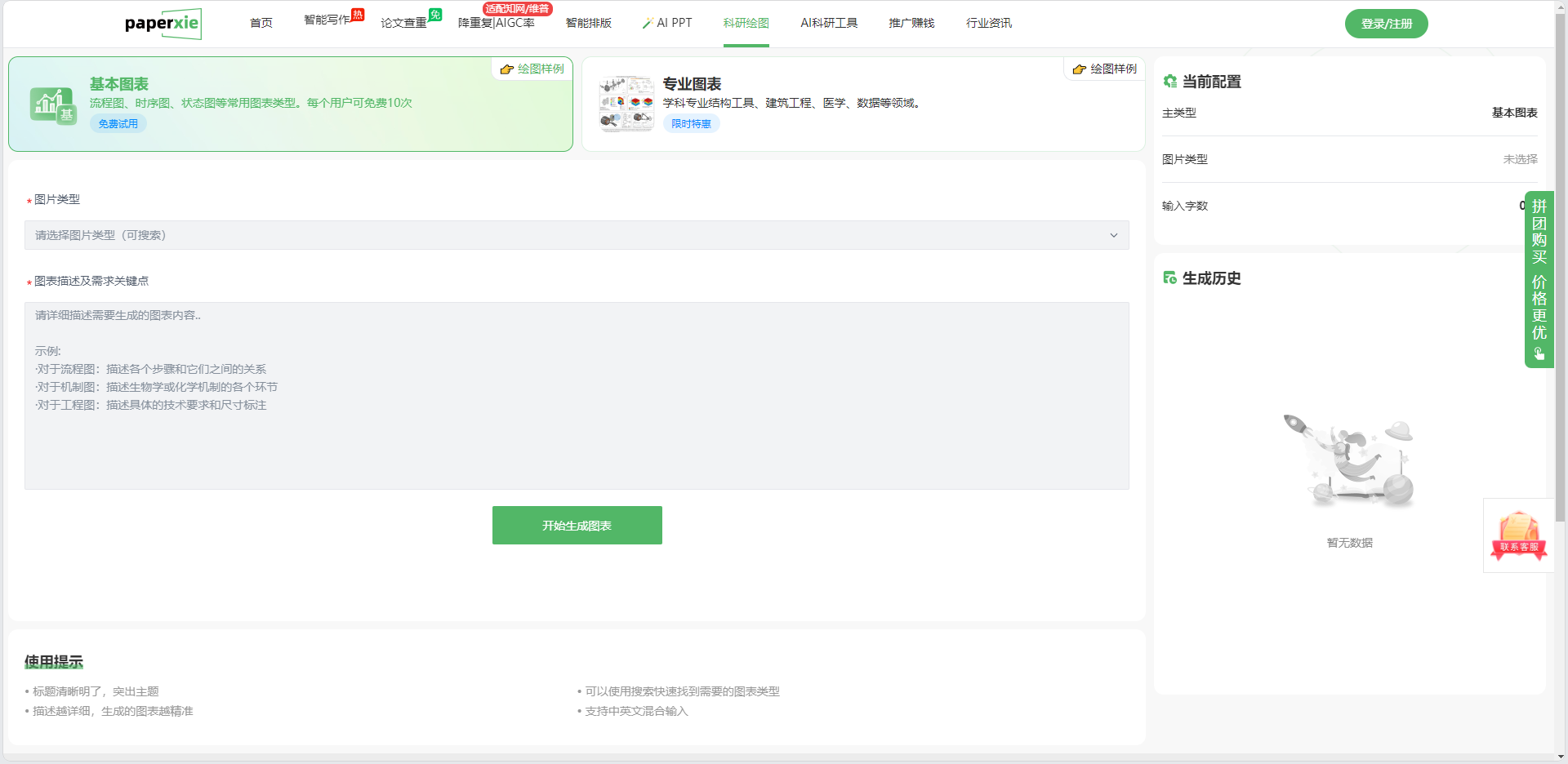 打开 paperxie 的科研绘图页面,首先会看到“基本图表” 和 “专业图表”两大分类,直接对应不同场景的需求:
