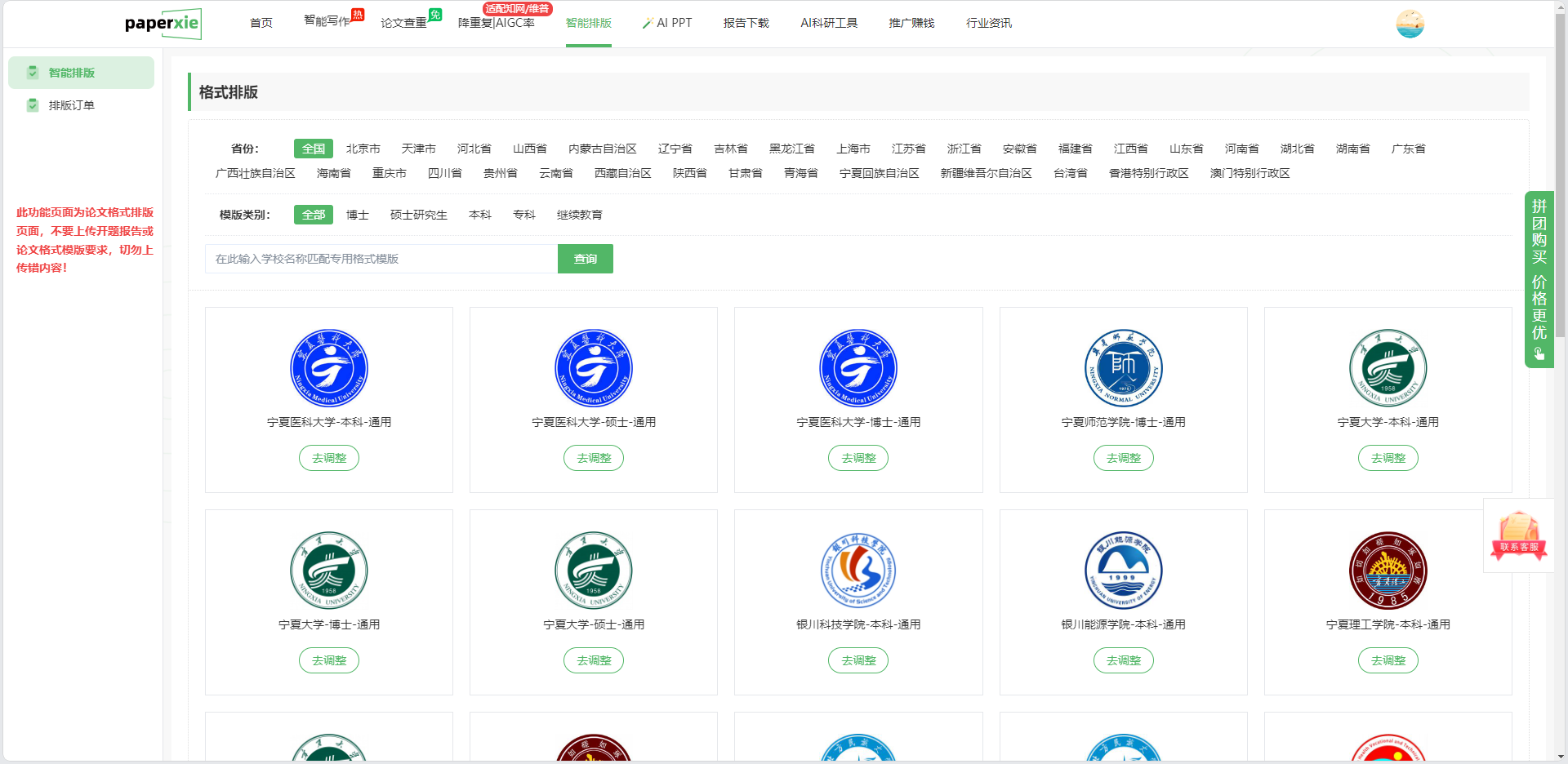 以宁夏大学的 “硕士模板” 为例,点击 “去调整” 后,系统会自动完成以下操作: