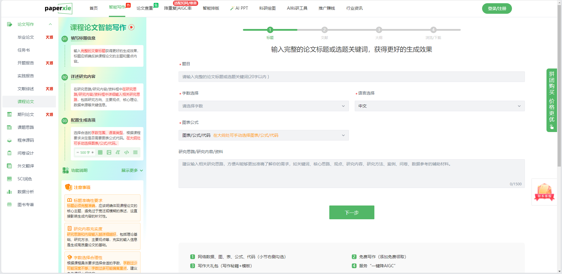 打开 paperxie 的课程论文写作页面,整个流程被拆成 “填写标题→详述内容→配置选项” 三个步骤,像做 “论文模板填空题” 一样降低门槛:
