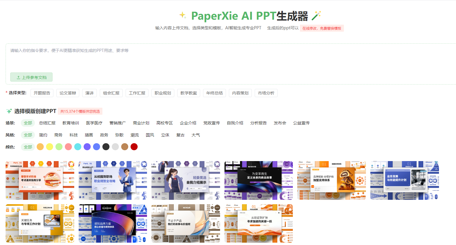 传统 PPT 模板库的痛点,是 “模板多但匹配度低”—— 而 paperxie 的模板选择逻辑,是 “场景 + 风格 + 颜色” 的三维筛选: