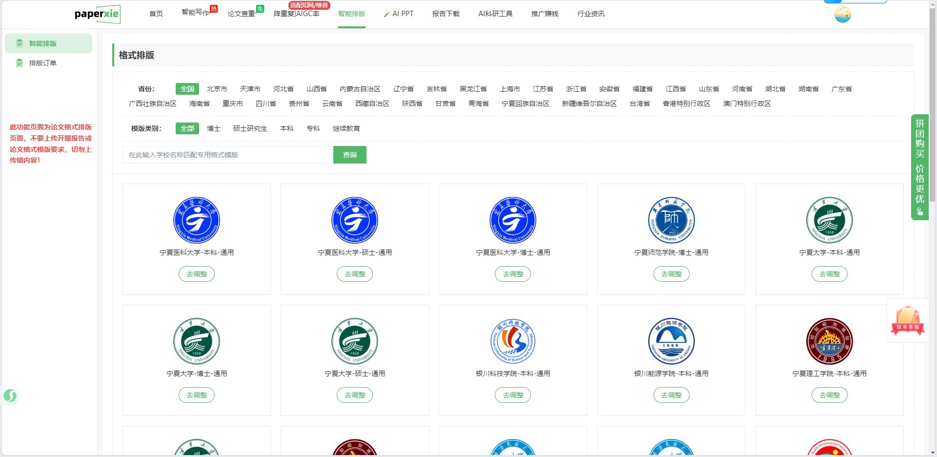 在学术工具的生态里,“论文排版” 工具并不少,但多数要么是通用模板(无法匹配院校专属要求),要么是手动调整(效率极低)。而 paperxie 推出的智能排版功能,核心是通过 “省份 + 学历 + 院校” 的三维精准匹配,直接调用对应院校的专属格式模板 —— 它并非 “排版软件的替代者”,而是帮创作者跳过 “找模板、调格式、校细节” 的重复劳动,让论文格式一步适配院校规范。