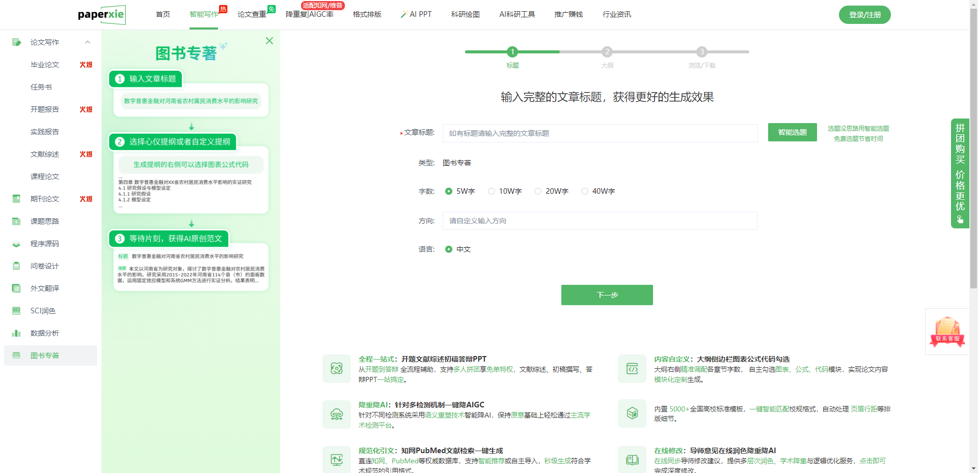如果只把 PaperXie 当成 “初稿生成工具”,那就太可惜了。从界面下方的功能介绍就能看出,它提供的是一套覆盖专著写作全生命周期的解决方案。