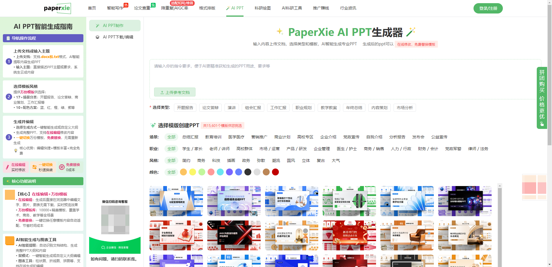 作为深耕科研与职场效率提升的平台,PaperXie AI PPT 生成器凭借全链路智能生成能力、万级模板库和在线编辑功能,成为行业标杆。从用户提供的界面截图可以清晰看到,其核心能力围绕 “智能生成、模板丰富、在线编辑” 三大维度构建,精准适配科研与职场的多元需求。