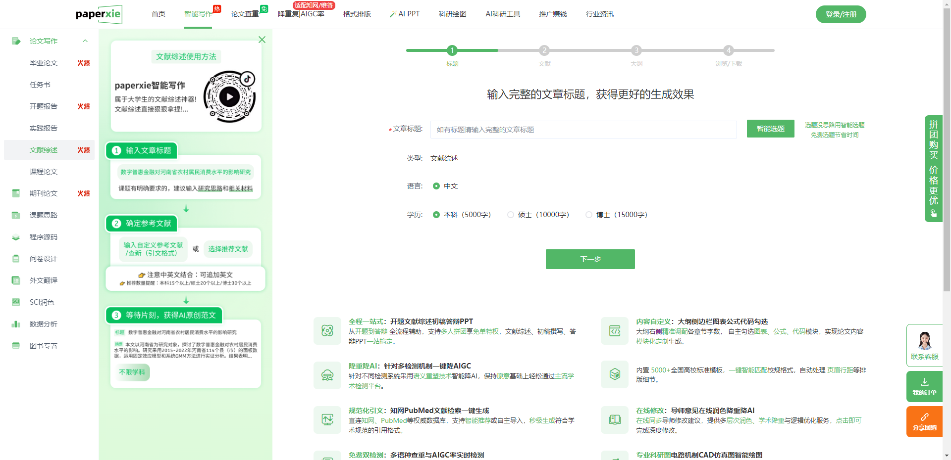 打开 paperxie 的智能写作页面,左侧菜单栏直接把「文献综述」标成了「火爆」选项,点进去就能看到清晰的三步引导框,完全不用自己摸索功能入口,对零基础学生特别友好: