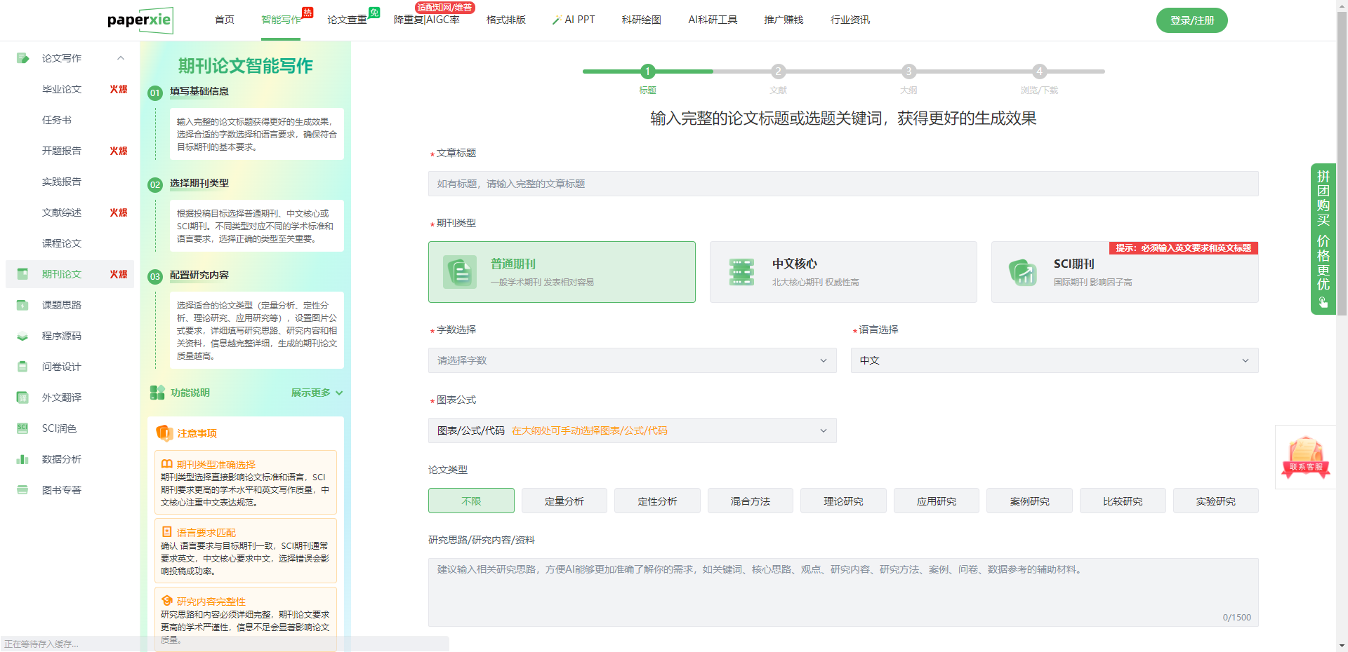 PaperXie 提供了 “普通期刊”“中文核心”“SCI 期刊” 三个选项,这一设计的精妙之处在于 ——把规范要求前置到写作之初。