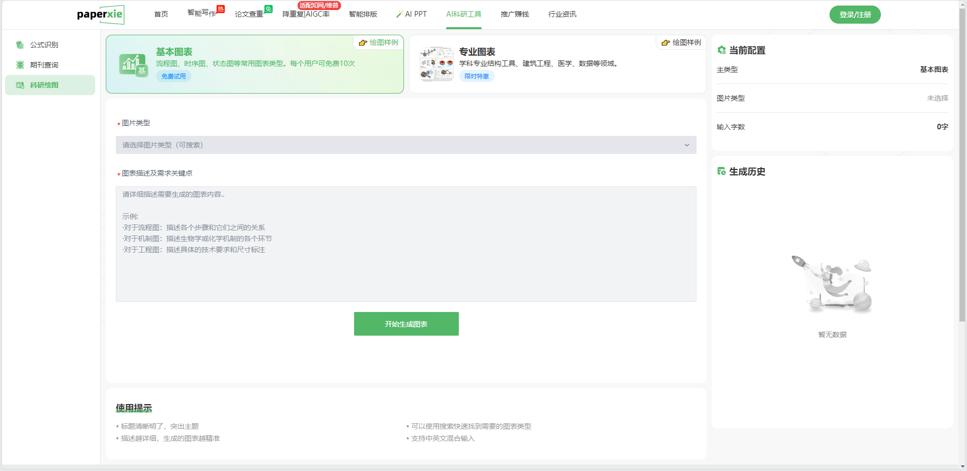 同时,界面还区分了 “基本图表” 和 “专业图表” 两类服务:基本图表支持流程图、时序图等通用类型,每个用户可免费使用 10 次;专业图表则覆盖建筑工程、医学、数据等细分领域(当前标注 “限时特惠”)—— 这种分类既满足了普通用户的基础需求,也覆盖了专业领域的精准场景。