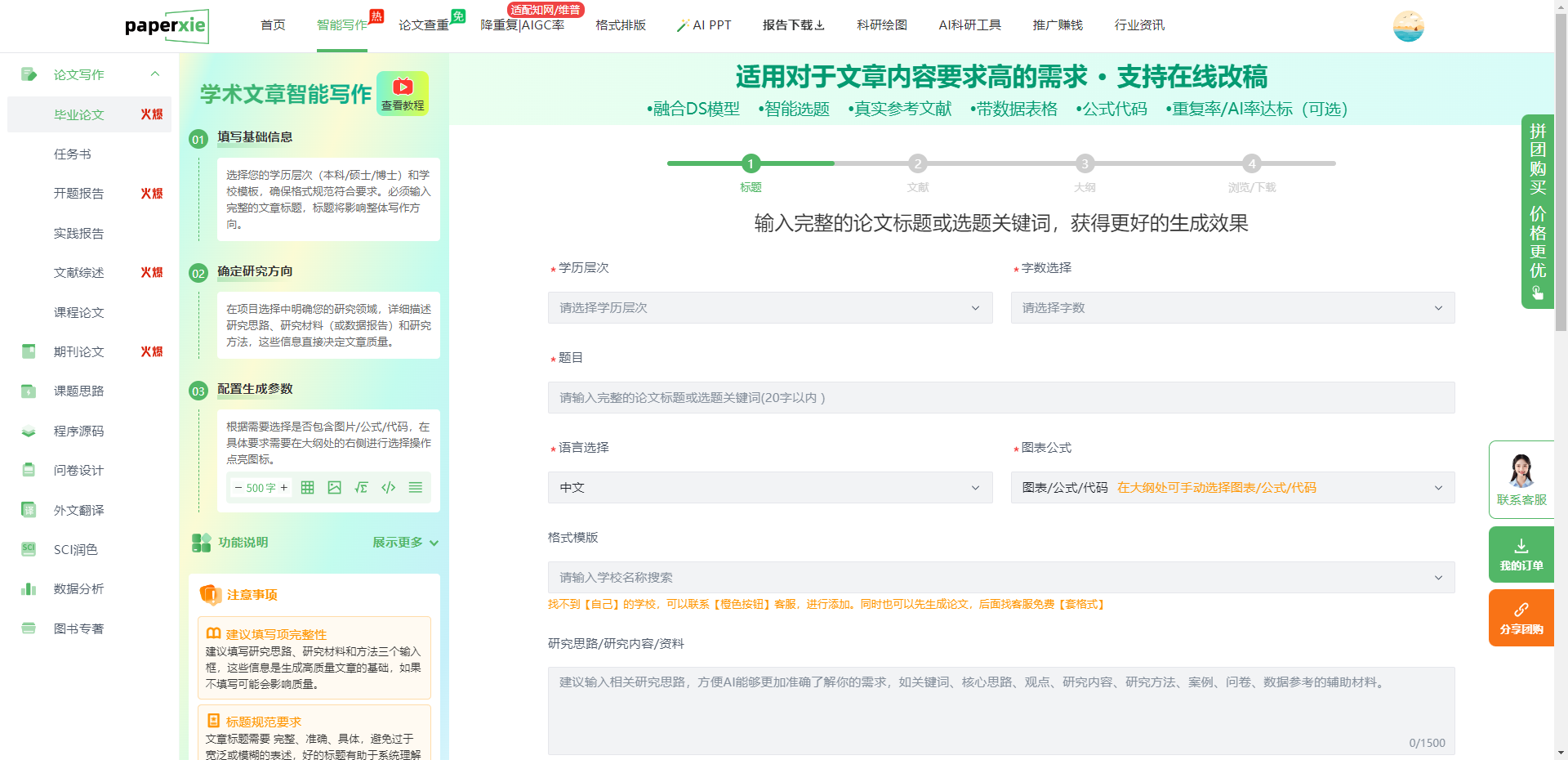 - 填写基础信息:选择学历、字数,输入选题关键词,匹配学校格式模板,填充研究思路;