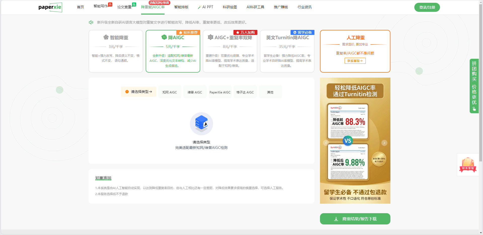很多普通降重工具,只针对 “中文查重”,完全不懂 Turnitin 的检测逻辑 —— 而 paperxie 的英文 Turnitin 降 AIGC 功能,是 “留学必备” 标签下的服务,直接对标 Turnitin 的 AI 检测标准,改写后的内容能精准避开 Turnitin 的 “雷区”。