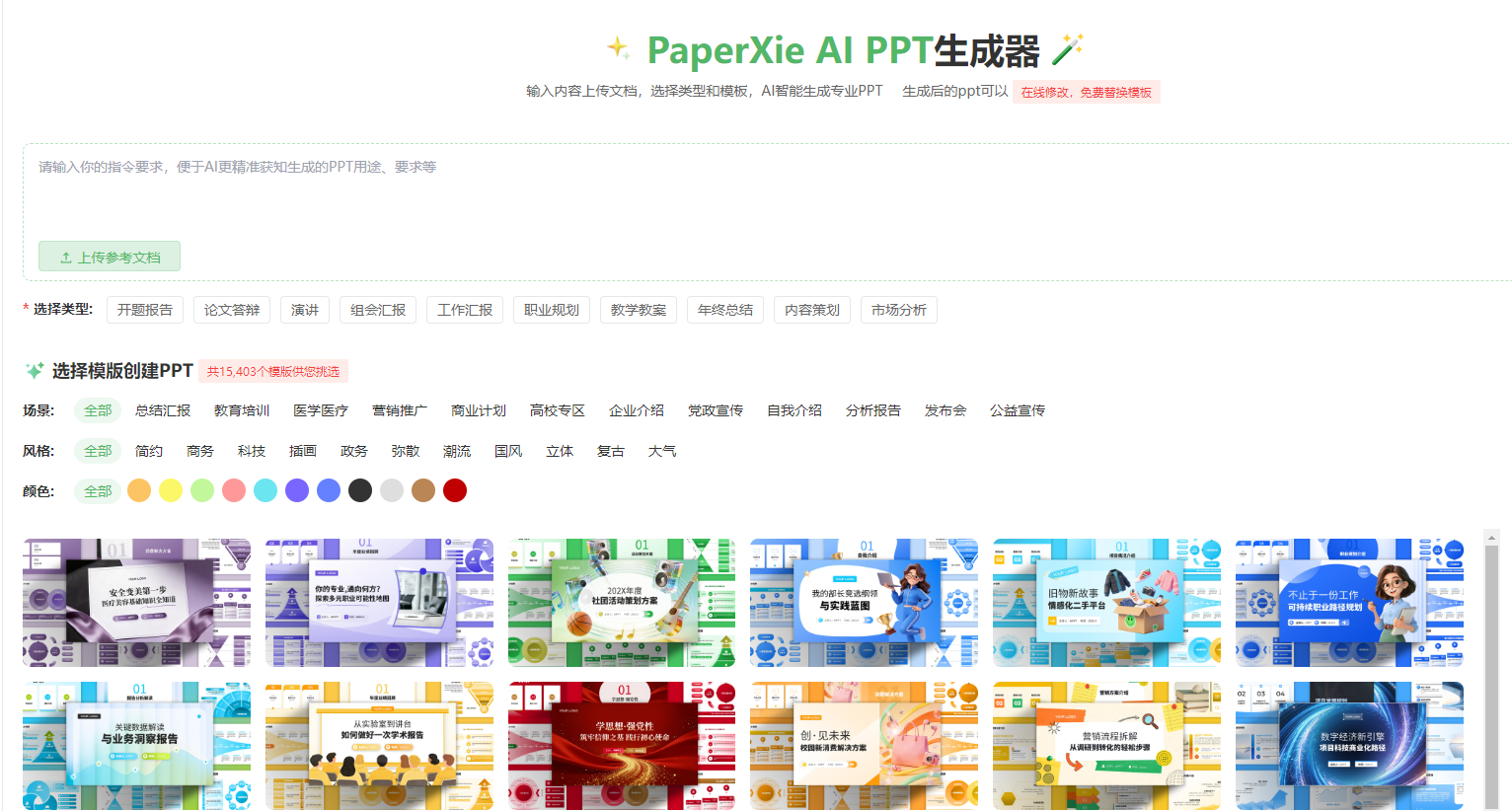 PaperXie AI PPT 的模板库,已实现 “场景 - 风格 - 颜色” 的精细化分类: