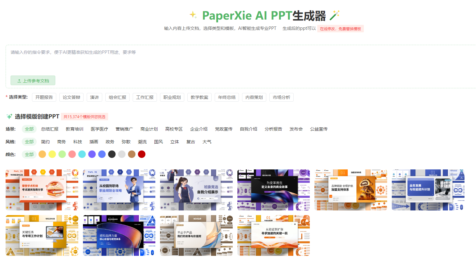 做 PPT 最头疼的,是 “找不到适配场景的模板”—— 开题报告要学术风,工作汇报要商务风,演讲要活泼风,挨个找模板能耗掉半天时间。而 paperxie 的 AI PPT 功能,直接把 “场景 + 风格” 的组合库做到了极致: